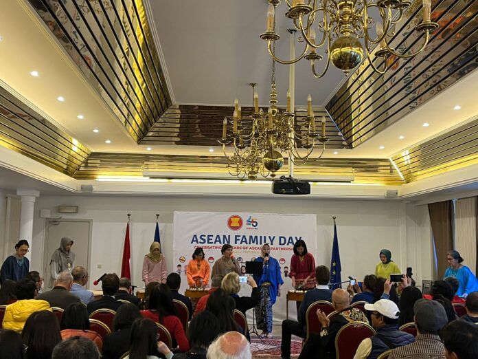 SHNet,Brussel-Aula Rajawali KBRI Brussel diramaikan oleh ASEAN Family Day yang dihadiri perwakilan diplomatik negara-negara ASEAN di Brussel dan juga perwakilan dari Uni Eropa. Setiap negara ASEAN mempersembahkan pertunjukan kesenian serta berbagai hidangan khas dari negaranya masing-masing untuk turut memperingati kemitraan ASEAN dengan Uni Eropa.