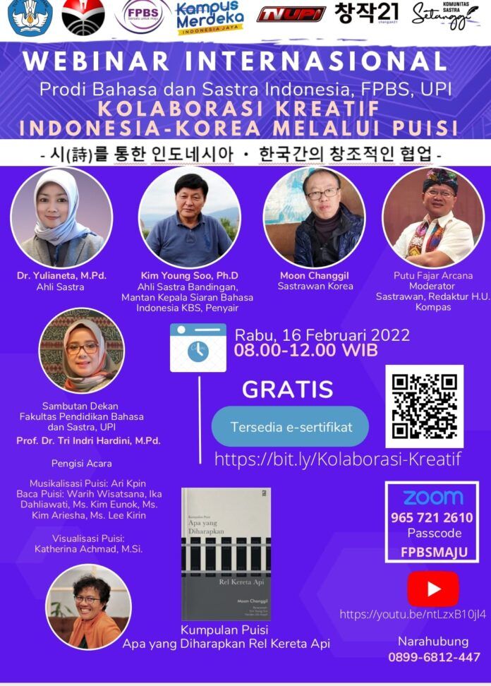 Untuk mengupas dan mendiskusikan lebih dalam bagaimana kondisi dan persoalan politik, sosial, budaya, dan sejarah terepresentasikan dalam puisi-puisi tersebut dan bagaimana kolaborasi kreatif Indonesia- Korea melalui puisi, Prodi Bahasa dan Sastra Indonesia Depdiksatrasia FPBS UPI bekerja sama dengan Komunitas Sastra Setanggi ( Indonesia), Kelompok Sastrawan Changjak 21 beserta Majalah Sastra Musiman Changjak 21 (Korea Selatan) menyelenggarakan Webinar Internasional ” Kolaborasi Kreatif Indonesia-Korea melalui Puisi”. Akan tampil sebagai narasumber: Dr. Yulianeta, M.Pd ( Dosen UPI, ahli sastra),