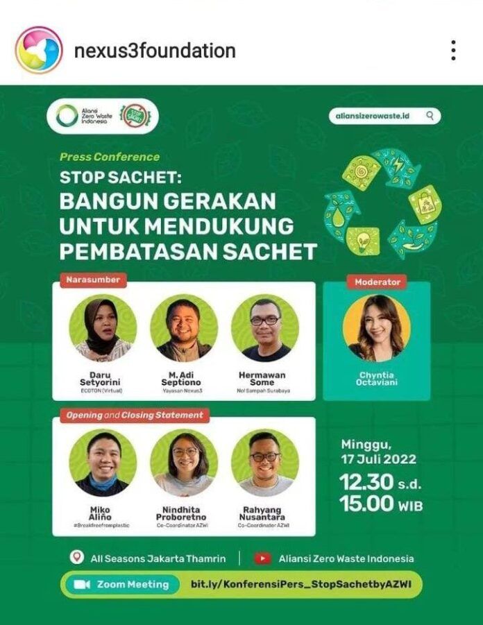 Jakarta-Aliansi Zero Waste Indonesia (AZWI) menyerukan untuk penghentian penggunaan kemasan plastik sekali pakai seperti sachet dan lain-lain yang sampahnya tidak dapat didaur ulang secara aman dan berkelanjutan dan ditemukan mencemari lingkungan, baik di darat maupun di laut. Para aktifis lingkungan yang tergabung dalam aliansi ini ingin mengubah narasi daur ulang sachet menjadi narasi guna ulang dan isi ulang secara signifikan.