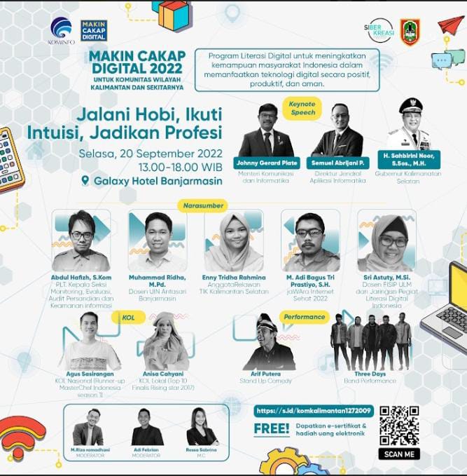 Demikian kesimpulan webinar bertema “Jalani Hobi, Ikuti Intuisi, Jadikan Profesi” yang digelar Kementerian Komunikasi dan Informatika RI bersama Gerakan Nasional Literasi Digital (GNLD) Siberkreasi, Selasa (20/9), di Banjarmasin, Kalimantan Selatan.
