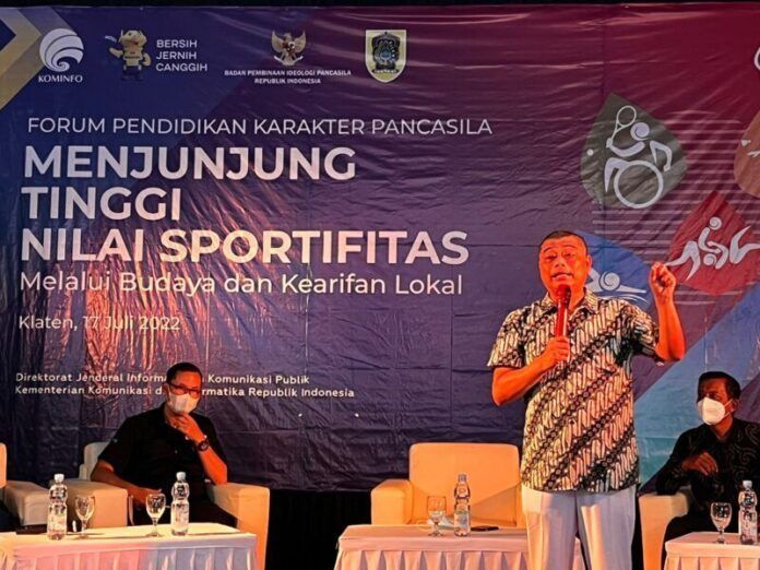 KLATEN-Antonius Benny Susetyo, Staf Khusus Ketua Dewan Pengarah Badan Pembinaan Ideologi Pancasila, menyerukan semangat sportifitas untuk masyarakat di Juwiring, Klaten, pada hari Minggu (17/07/2022), dalam acara Forum Pendidikan Karakter Pancasila: Menjunjung Tinggi Nilai Sportifitas Melalui Budaya dan Kearifan Lokal.