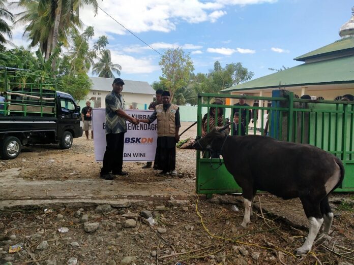 Jakarta- Badan Strategi Kebijakan Dalam Negeri (BSKDN) Kementerian Dalam Negeri (Kemendagri) selaku Panitia Penyelenggara Iduladha 1444 Hijriah di Lingkungan Kemendagri dan Badan Nasional Pengelola Perbatasan (BNPP) menyerahkan hewan kurban ke masyarakat di wilayah perbatasan. Adapun pemotongan hewan kurban tersebut berlangsung di Pos Lintas Batas Negara Terpadu (PLBN) Wini Provinsi Nusa Tenggara Timur (NTT) pada Kamis, 29 Juni 2023.