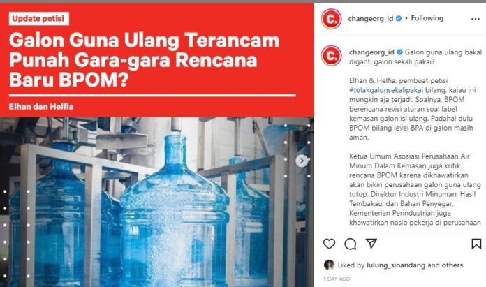“Jangan-jangan 2022 nanti, semua bakal pake galon sekali pakai,” sebut Change.org Indonesia dalam statusnya diikuti emoji muka terkejut plus takut dan tagar #tolakgalonsekalipakai. Change.org Indonesia ini juga menampilkan petisi baru yang digagas Elhan dan Helfia berjudul “Galon Guna Ulang Terancam Punah Gara-gara Rencana Baru BPOM?” yang diupdate pada 13 Desember 2021.