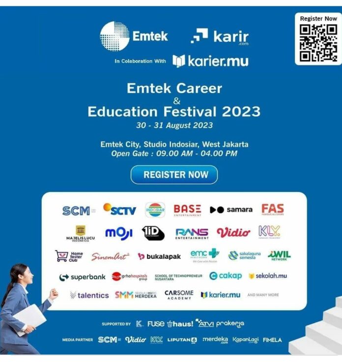 SHNet, Jakarta-PT Elang Mahkota Teknologi Tbk (Emtek) dan PT Qerja Manfaat Bangsa (Karir.com) tahun ini menyelenggarakan Emtek Career & Education Festival 2023. Kegiatan ini berkolaborasi dengan Karier.mu (PT Semesta Integrasi Digital) serta Program Kartu Prakerja. Salah satu highlight yaitu penyelenggaraan event Job Fair yang dikemas secara hybrid yaitu onsite dari Emtek City, Studio Indosiar, Daan Mogot Jakarta dan streaming melalui Vidio.com pada 30-31 Agustus 2023.