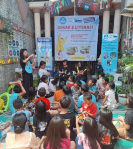 SHNet, Jakarta-Banyak cara dan metode untuk sosialisasi literasi membaca kepada masyarakat, khususnya kepada anak-anak. Salah satu yang menyenangkan dan menarik minat anak-anak untuk aktif dalam kegiatan ini adalah acara yang disebut “Gerak dan Literasi”. Karena itu dalam rangka kegiatan penguatan literasi masyarakat, Taman Bacaan Masyarakat (TBM) Bukit Duri Bercerita bekerjasama dengan Sahabat Literasi Aruna, menggelar acara “Gerak dan Literasi”, Sabtu (26/10/2024).