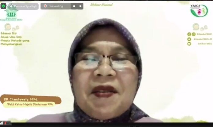 “Orang tua sudah seharusnya paham, bahwa di usia golden age ini, anak diibaratkan dengan komputer baru yang masih kosong, belum diisi oleh apapun. Sama halnya dengan anak-anak, orang tua dan guru di lingkungan PAUD semestinya sudah paham mengenai nutrisi dan info yang tepat untuk tumbuh kembang anak, terutama perkembangan otak,” hal ini disampaikan Chandrawaty saat mengisi Webinar Nasional Edukasi Gizi Sejak Usia Dini Melalui Metode yang Menyenangkan, hasil kerjasama antara Yayasan Abhipraya Insan Cendekia Indonesia (YAICI) dengan Ikatan Guru Bustanul Athfal (IGABA).