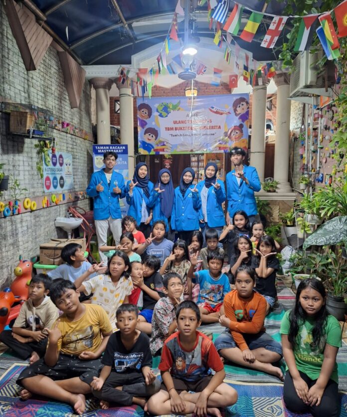 Kelompok 1 Mahasiswa Jurusan Ilmu perpustakaan, UIN Syarif Hidayatullah Jakarta bersama saat memberikan edukasi tentang Rambu-rambu Lalu Lintas di TBM Bukit Duri Bercerita, Sabtu malam (21/12/2024). Kegiatan ini bersamaan juga dengan Peringatan Hari Ibu