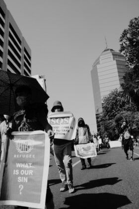 Surabaya-“Tanggung jawab atas 10 tahun kami, kami ingin proses!” suara puluhan pengungsi berjalan kaki dari depan Hotel Bumi Surabaya menuju ke kantor Human Right (kanwil) Surabaya, Senin (20/7/2022).