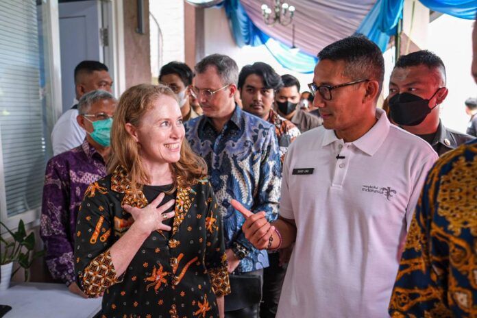 Turut mendampingi Menparekraf Sandiaga, Deputi Bidang Industri dan Investasi Kemenparekraf/Baparekraf, Henky Hotma Parlindungan Manurung; Staf Ahli Bidang Pengembangan Usaha Kemenparekraf, Dadang Rizki Ratman. (Stevani Elisabeth)