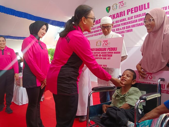SHNet, Ende, NTT – Ketua Umum Bhayangkari, Ny. Julianti Sigit Prabowo, melaksanakan rangkaian kegiatan Bhayangkari Peduli di Kabupaten Ende, Nusa Tenggara Timur, Rabu (1/10/2025). Kegiatan ini meliputi penyaluran bantuan sosial, bakti kesehatan, serta bakti religi yang dipusatkan di halaman Kantor Camat Ende Utara, Kelurahan Kota Raja, Kecamatan Ende Utara.