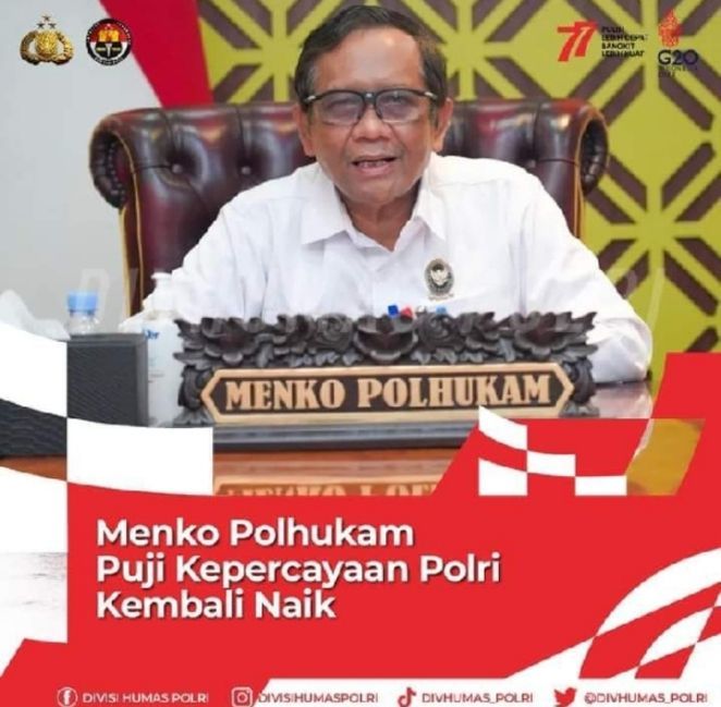 SHNet, JAKARTA – Menteri Koordinator Bidang Politik, Hukum, dan Keamanan (Menko Polhukam) Republik Indonesia Prof. Dr. H. Mohammad Mahfud, S.H., S.U., M.I.P., mengaku senang atas kepercayaan yang diberikan masyarakat terhadap Polri, Kamis (01/09/2022).