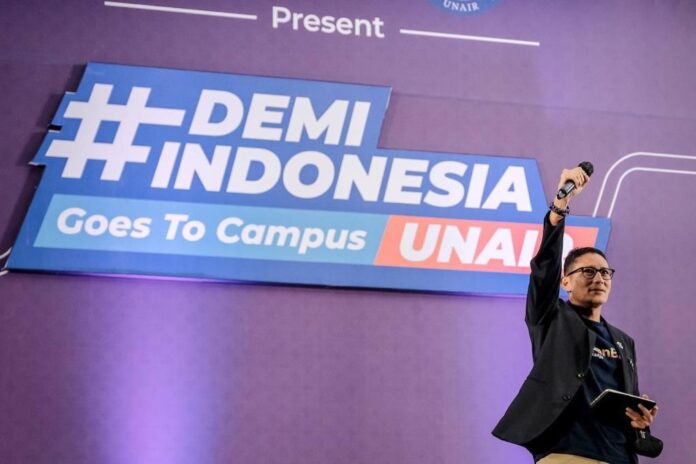 SHNet, Surabaya– Menteri Pariwisata dan Ekonomi Kreatif/Kepala Badan Pariwisata dan Ekonomi Kreatif (Menparekraf/Kabaparekraf) Sandiaga Salahuddin Uno menekankan pentingnya peran mahasiswa sebagai agent of change dalam mendorong lebih banyak lahirnya wirausaha di Indonesia sehingga lapangan pekerjaan semakin luas.