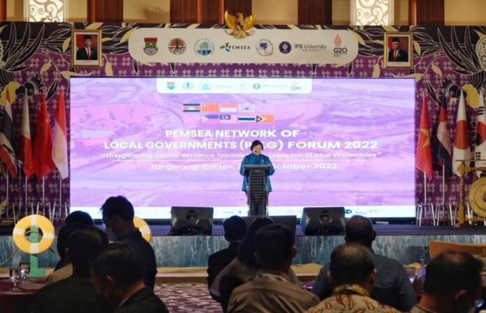 ’’Konsep blue-economy merupakan suatu konsep yang secara simultan mempromosikan pertumbuhan ekonomi dengan kelestarian lingkungan, inklusi sosial dan penguatan ekosistem kelautan,’’ kata Menteri Lingkungan Hidup dan Kehutanan Prof. Dr. Ir. Siti Nurbaya, M.Sc saat menyampaikan pidato kunci di acara pembukaan PEMSEA (Pengelolaan Lingkungan Pesisir di Asia Timur) Network of Local Government (PNLG) Forum 2022 yang dilakukan secara hybrid, luring dan daring, dengan mengangkat tema ’’Strengthening Coastal Resilience Towards Sustainable Local Blue Economies’’ di Kabupaten Tangerang, Provinsi Banten. Acara berlangsung tanggal 25-29 Oktober 2022.