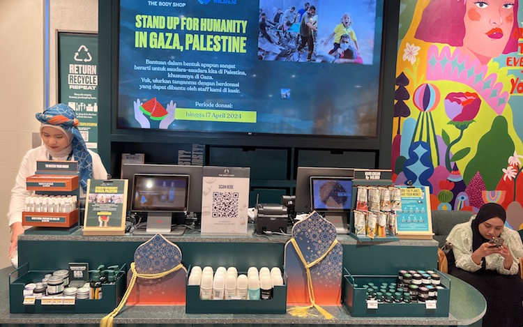 Suasana gerai The Body Shop di PIM 1, Jakarta Selatan yang menunjukkan kalau mereka juga memberikan dan mengumpulkan donasi bagi saudara-saudara kita di Gaza, Palestina dalam kerangkan program Bersatu untuk Kemanusiaan yang telah berhasil mengumpulkan Rp.1,8 milyar. (SHNet/Nonnie Rering).