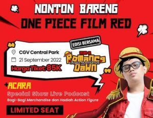 Tepatnya Rabu, 21 September 2022 besok, Arya Novrianus bersama podcast Romance Dawn akan menggelar acara Nonton Bareng One Piece Film: Red di CGV Central Park Jakarta. Acara ini akan diramaikan dengan Special Show Live Podcast, bagi-bagi merchandise