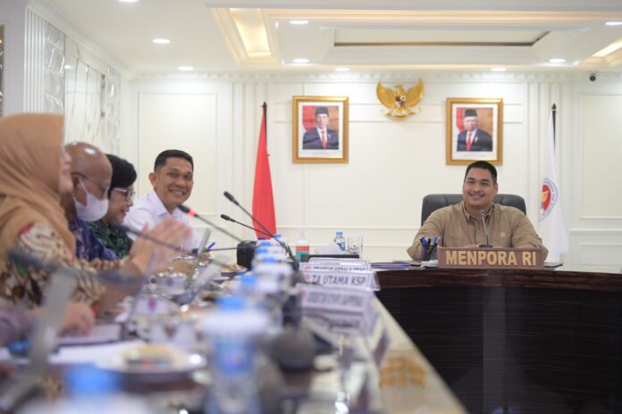 SHNet, Jakarta – Menteri Pemuda dan Olahraga Republik Indonesia (Menpora RI) Dito Ariotedjo menerima Deputi II Bidang Pembangunan Manusia Kantor Staf Presiden (KSP) Abetnego Tarigan beserta rombongan, di Ruang Rapat Lantai 10 Graha Pemuda Senayan Jakarta Pusat, Jum’at (28/4) siang.